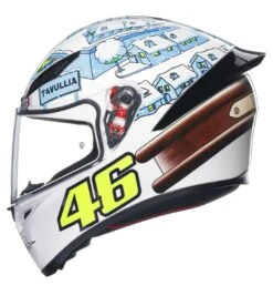 Het design van de K1 Rossi Winter Test is een replica gebaseerd op de racehelm van Valentino Rossi met het startnummer ’46’ in winterthema.