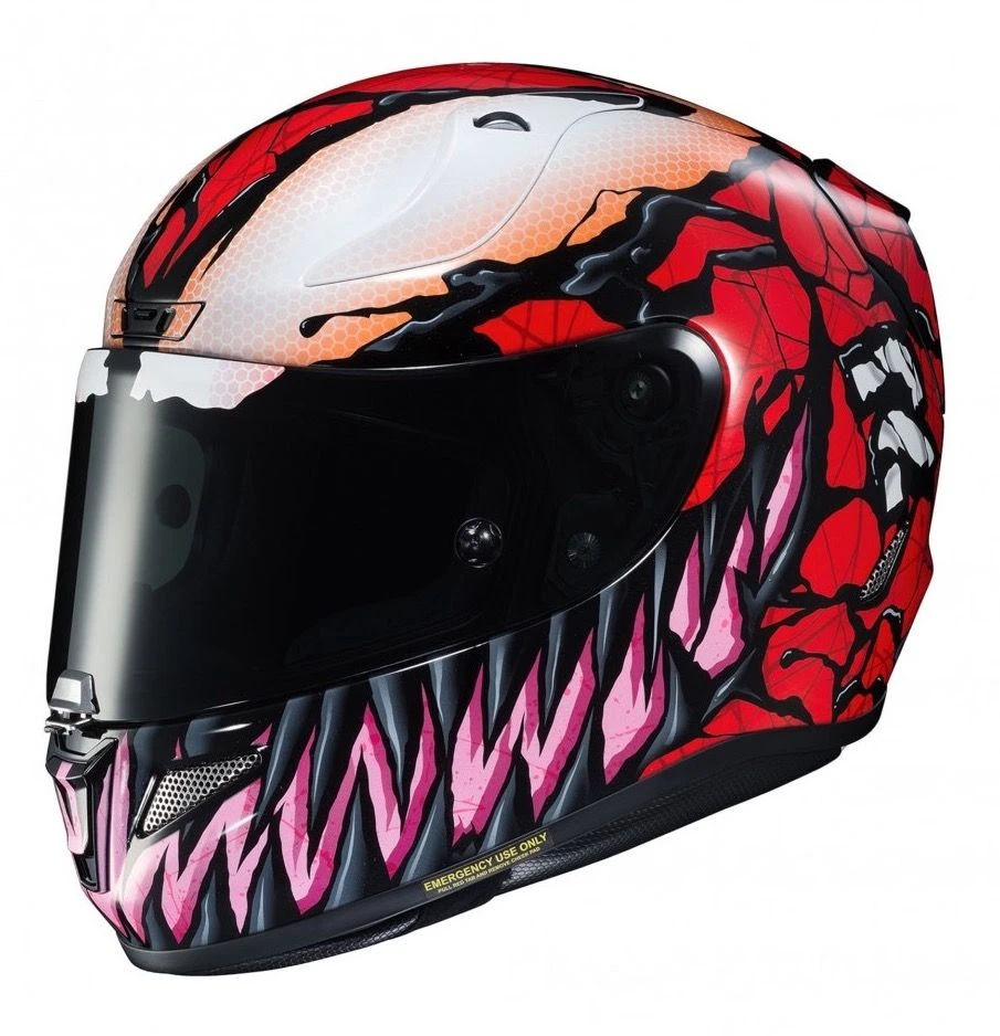 De populaire Venom van HJC heeft er nu een vijand bij zoals dat ook in de Marvel series is. Carnage heeft inmiddels de weg gevonden naar de ultieme racehelm van de Koreanen. Ontwikkeld voor het snellere werk en in deze graphics een echte eyecatcher. Zo kun je er uitstekend mee uit de voeten op een sportbike en schroom je niet voor een uitstapje op het circuit. De zeer compacte glasvezel helmschaal en uitgebreide ventilatie maken hem zo populair. En oja, om die looks helemaal af te maken wordt een donker vizier standaard meegeleverd.