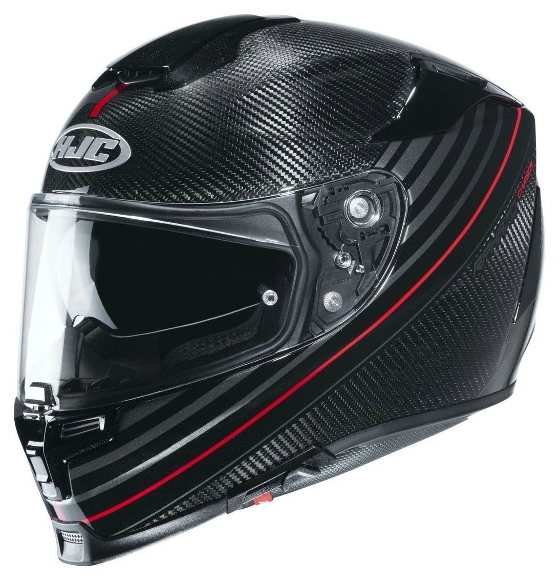 Voor de buitenschaal wordt het P.I.M. Plus materiaal – een combinatie van Carbon, Kevlar en Glasvezel – gebruikt. Het resultaat is een oersterke en vederlichte helm. Dankzij langdurige tests in de windtunnel is HJC erin geslaagd om een stille helm te ontwikkelen met stabiliteit ook op hoge snelheden. Een Dubbel D-kinbandsluiting houdt de helm op zijn plek. Bij een noodgeval kunnen eenvoudig de wangkussens worden verwijderd.